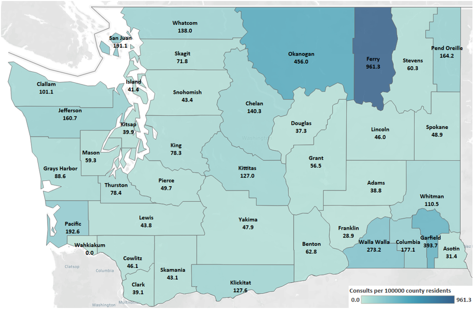 To date, PCL consultations have helped providers and/or patients from 38 of Washington’s 39 counties. This map shows the number of PCL consultations per 100,000 county residents from July 2019 through June 2025. Nearly half of Washington counties do not have a practicing psychiatrist1, many of which had higher consult rates (consults per 100,000 residents) than those with more psychiatrists. We are encouraged that the PCL is being used so widely across our state.